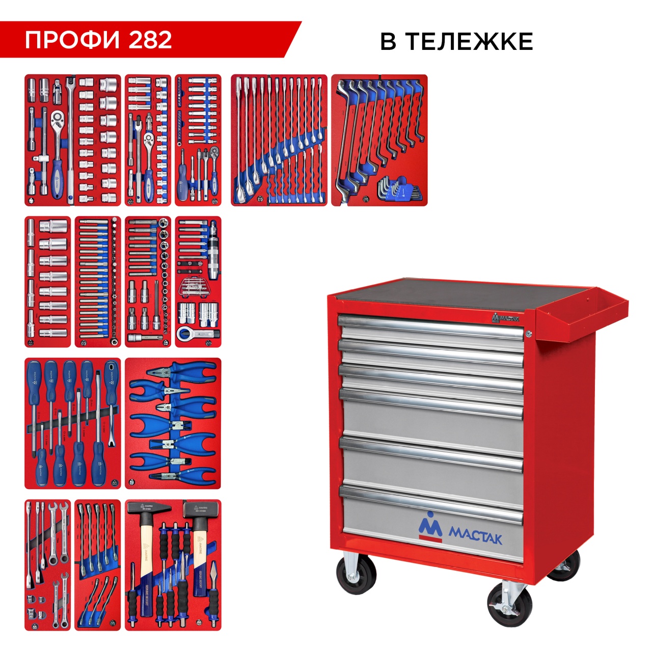 ----Набор инструментов "ПРОФИ 282" в красной тележке, 282 предмета МАСТАК 52-06282R
