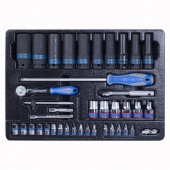Набор включает в себя ударные глубокие торцевые головки, предназначенные для работы с пневматическим инструментом. Входящий в материал головок хром-молибденовый сплав придаёт особую прочность и стойкость к ударным нагрузкам. Широкий ряд головок формата 1/4", формат головок Е-стандарта (TORX) делают незаменимым набор для работы с мелким крепежом, нестандартным и другим крепежом, часто встречающимся в иномарках. Материал ложемента – ПВХ (поливинилхлорид). Изготовлен специально для комплектации инструментальной тележки.
